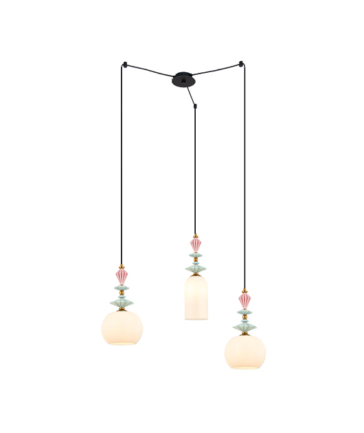 Κρεμαστό τρίφωτο φωτιστικό κατασκευασμένο από μέταλλο, κεραμικά στοιχεία και γυαλί οπαλίνα,